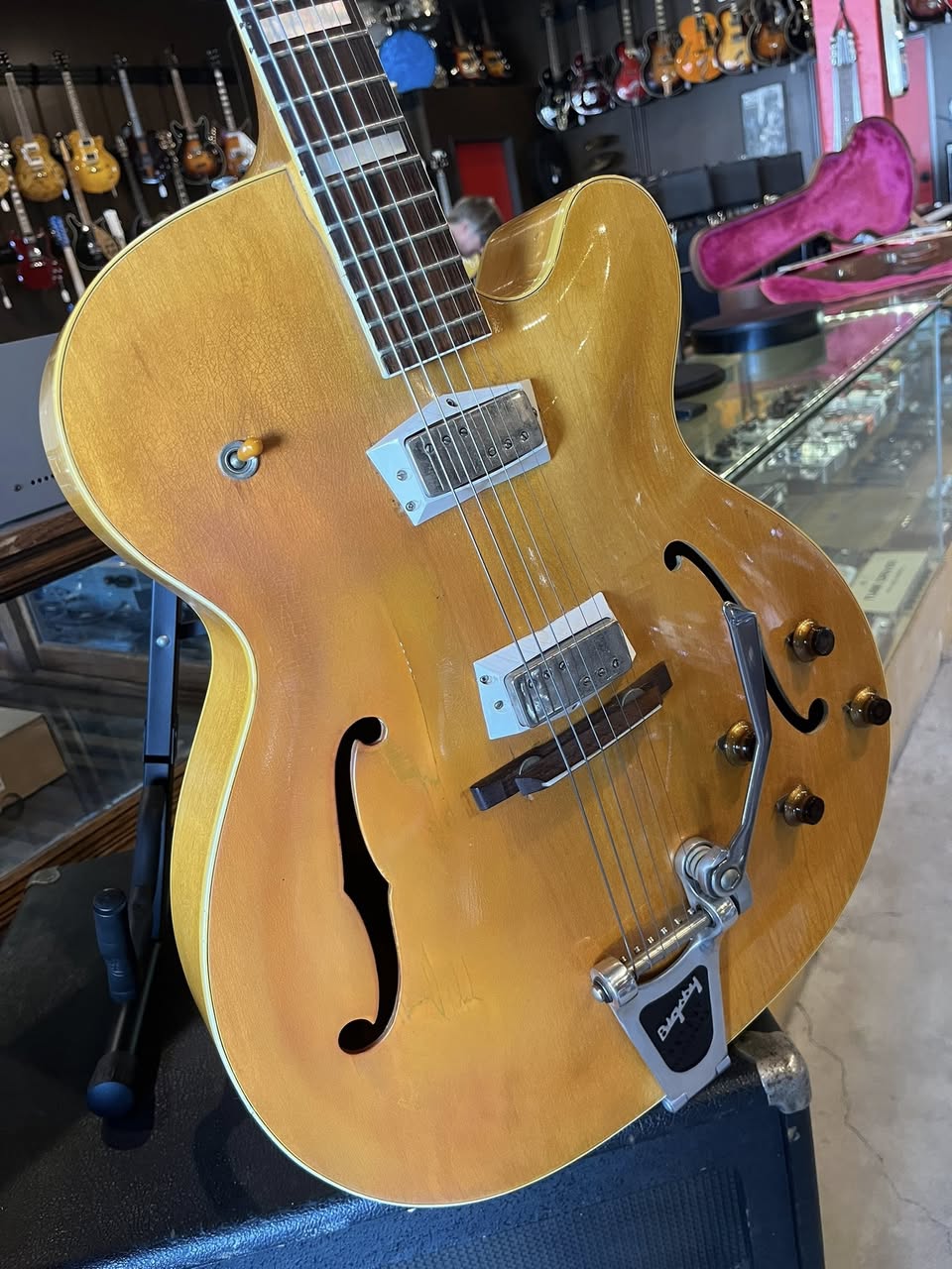 1961 Epiphone Broadway w/ohsc – $1,895 Top has had some overspray and repairs. Bridge, tuners, pickups, knobs, and Bigsby all added by previous owner.